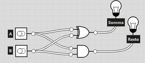 - Half adder: Un circuito molto semplice che fa la somma di 2 bit (calcolando il riporto in uscita) senza considerare alcun riporto in ingresso. Ha 2 uscite: