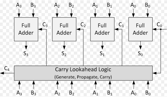 Il problema principale di questo addizionatore è che ogni full adder per andare avanti devo aspettare il calcolo del resto dell’adder precedente, questo crea dei rallentamenti. Il termine “ripple” indica che il riporto si propaga sequenzialmente da un bit al successivo, come un’onda. - Carry lookahaed adder: per risolvere il problema del ripple carry adder nasce questo tipo di addizionatore, che va a calcolare il resto in parallelo propagandolo in base a delle formule matematiche (funzioni e spiegato in seguito), tutto ciò lo rende più veloce e quindi viene ancora oggi usato dentro le ALU dei processori.