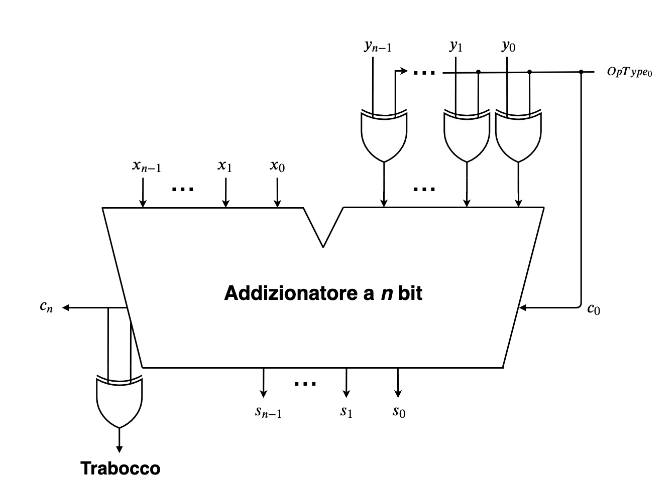 - Addizionatore algebrico: è un circuito logico che somma due numeri binari a n bit, considerando anche il segno, la parte importante per questo circuito è la gestione dell’Overflow, infatti viene calcolato utilizzando questo formula: con che sarebbe il riporto generato dall’ultimo bit, e il riporto generatore dal penultimo bit, in pratica se il risultato di questa formula ci da 1 c’è stato un trabocco.