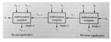 - Ripple carry adder: anche chiamato addizionatore con propagazione di riporto, si ottiene collegando tra di loro diversi full-adder in modo da propagare il riporto, di seguito la rappresentazione grafica: