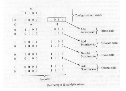 Moltiplicazione dei numeri con segno: per i numeri con il segno la situazione si complica un po’, usiamo l’algoritmo di Booth: L’algoritmo di Booth è un metodo efficiente per moltiplicare numeri binari con segno in complemento a due. L’idea chiave è ricodificare il moltiplicatore come somme e sottrazioni di potenze di 2. Nel caso semplice in cui il moltiplicatore contiene una sequenza contigua di 1, Il prodotto è uguale al moltiplicando fatto scorrere di 5 posizioni a sinistra + il complemento a 2 del moltiplicando fatto scorrere di 1 posizione a sinistra.