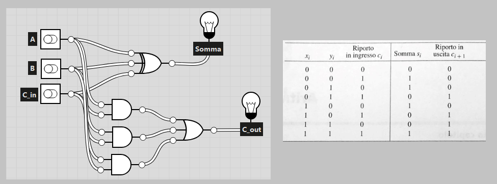 - Full adder: anche chiamato addizionatore ad 1 bit può essere espresso da 2 funzioni logiche a tre ingressi, i due bit da sommare (chiamati in seguito e ) e l’eventuale riporto in entrata (chiamato in seguito ):