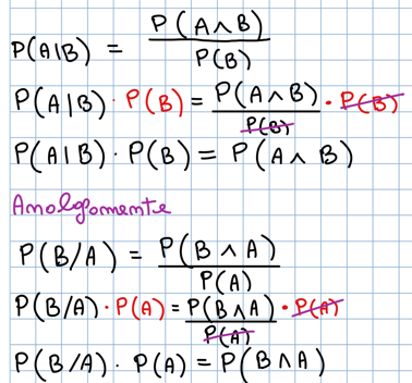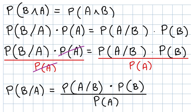 Come possiamo notare in questa immagine la probabilità di un evento A condizionata dal verificarsi di un evento B è uguale alla probabilità di un evento B condizionata da un evento A ovvero , da qui nasce la regola di Bayes ovvero:
