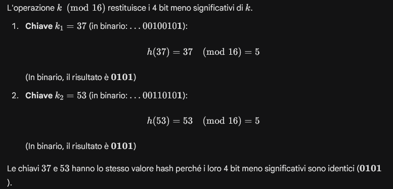 La funzione , avendo solitamente un codominio di cardinalità inferiore al dominio, non è una funzione biunivoca. Per il pigeonhole principle, se gli elementi da inserire nella Hash Table sono più degli indirizzi, almeno due chiavi finiranno allo stesso indirizzo. Quando due chiavi finiscono nella stessa cella, abbiamo un fenomeno chiamato collisione, dall’evitare le collisioni nascono tutti modi per implementare una tabella hash.