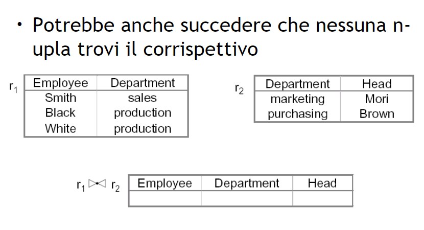 - Dangling ennuple: nel caso in cui alcuni valori tra gli attributi comuni non coincidono si hanno questo tipo di ennuple (come nel caso di seguito che mancano alcune ennuple)