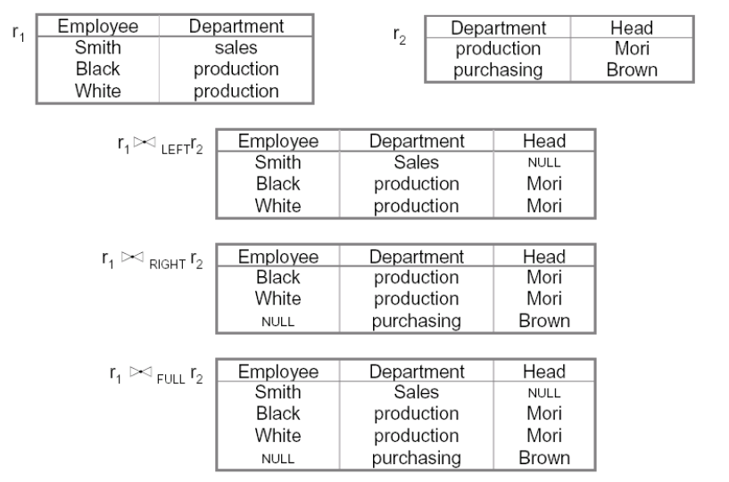 Siano ed due relazioni con attributi e rispettivamente, l’unione esterna è $$ R \overset{\leftrightarrow}{\cup} S = R \times {Z = NULL} \cup {X = NULL} \times S