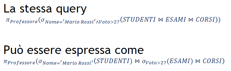 Due espressioni sono equivalenti se producono lo stesso risultato qualunque sia l’istanza attuale della base di dati, questo è un concetto molto importante nei dbms in quanto questi strumenti cercano di eseguire continuamente delle query equivalenti ma meno “costose”, un esempio potrebbe essere la query detta push selection ovvero: queste 2 sono due query equivalenti ma quella a sinistra è molto più efficiente