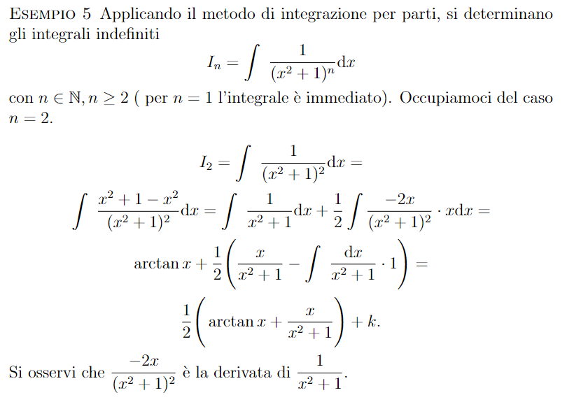 Esempio 10: Determiniamo si ha: quindi i fratti semplici saranno del tipo: cerchiamo di determinare : quindi deve essere , e quindi troviamo che sostituendo nei fratti semplici e integrando otteniamo che: Esempio 11: Determiniamo in questo caso i fratti semplici sono del tipo: si trova e quindi l’integrale richiesto risulta essere: Esempio 12: Determiniamo il denominatore ha discriminante negativo, quindi si procede nel seguente modo: I = \frac{1}{2} \int \frac{2x+8}{x^2+x+4} dx = \frac{1}{2} \int \frac{2x+1}{x^2+x+4} dx + \frac{1}{2} \int \frac{7}{x^2+x+4} dx = $$$$ = \frac{1}{2} \log(x^2+x+4) + \frac{7}{2} \int \frac{dx}{\left(x+\frac{1}{2}\right)^2 + \frac{15}{4}} = $$$$ = \frac{1}{2} \log(x^2+x+4) + \frac{7}{\sqrt{15}} \arctan \frac{2}{\sqrt{15}} \left(x+\frac{1}{2}\right) + k Esempio 13: Determiniamo e quindi risulta che: