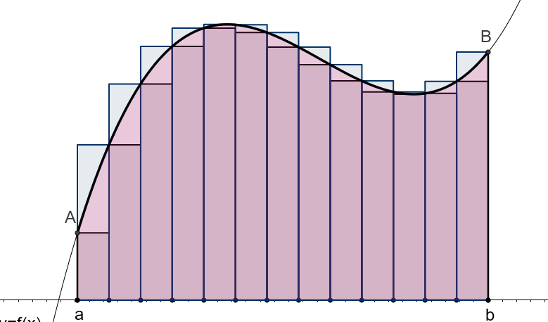 Osserviamo che la quantità rappresenta l’area di un rettangolo contenuto nella porzione di rettangoloide relativa all’intervallo . L’unione di tutti i rettangolo ottenuti in tal modo costituisce un plurirettangolo contenuto nel rettangoloide e la sua area è , analogamente fornisce l’area di un plurirettangolo contenente il rettangoloide.