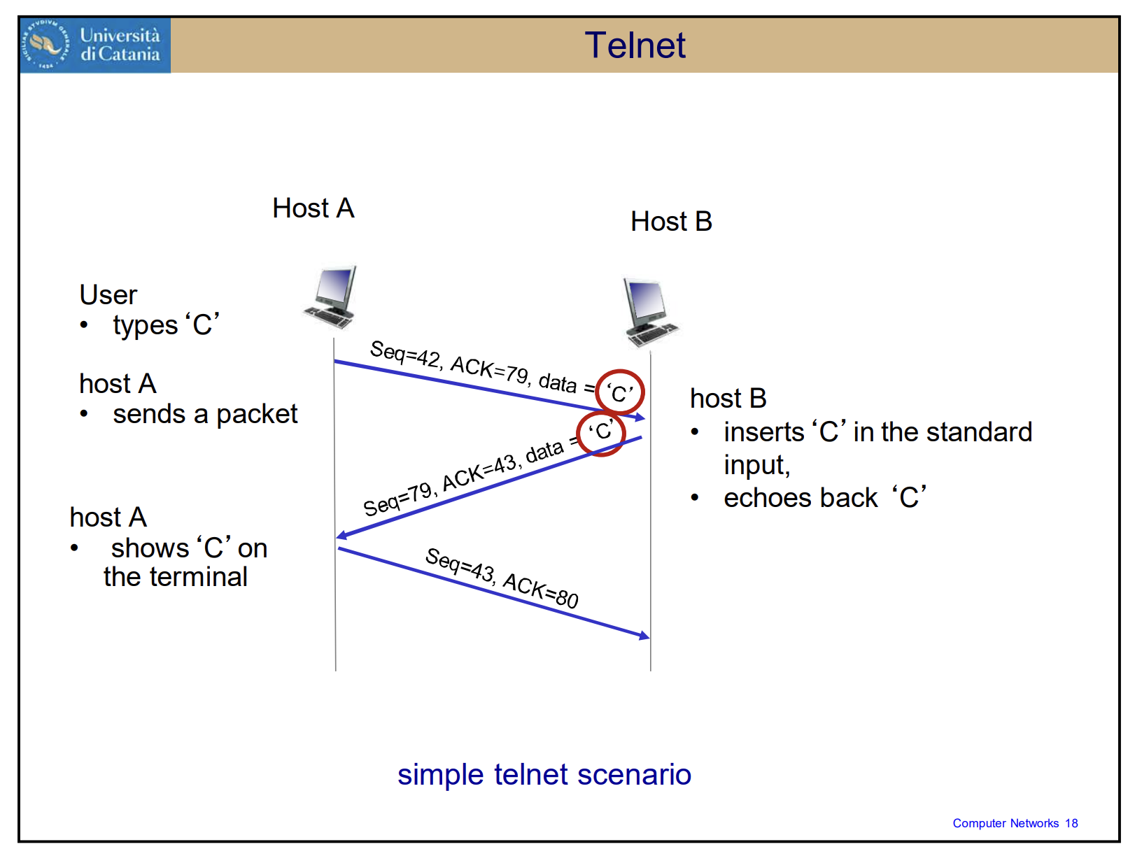 Host B riceve la ‘C’, la inserisce nel suo sistema e deve fare due cose: confermare di aver ricevuto il pacchetto e “rimandare indietro” il carattere per farlo apparire sullo schermo dell’utente (operazione chiamata Eco).