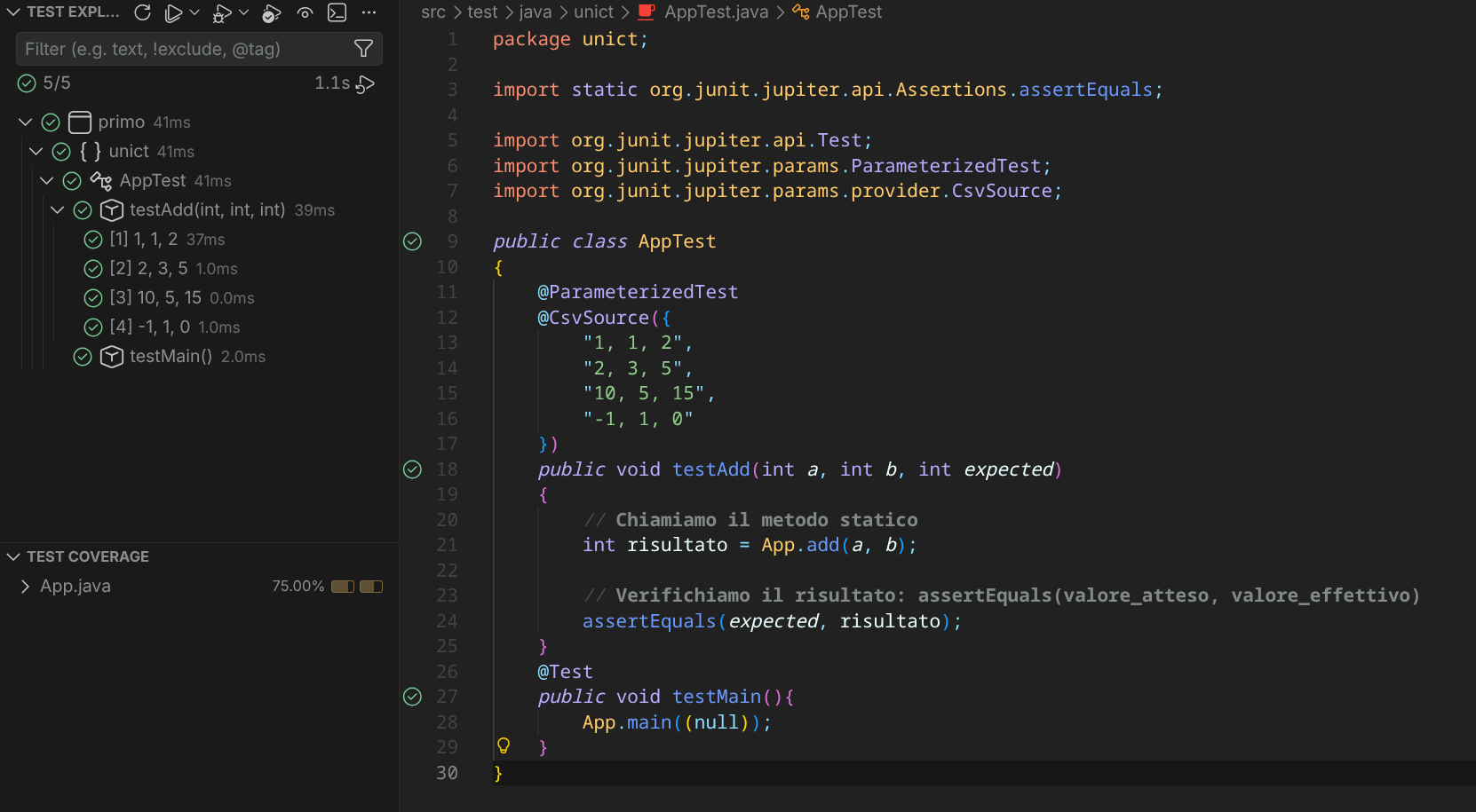 Possiamo specificare che il test è di tipo parametrico usando il decoratore @ParameterizedTest, per specificare invece quali sono i parametri in ingresso si può utilizzare il decoratore @CsvSource