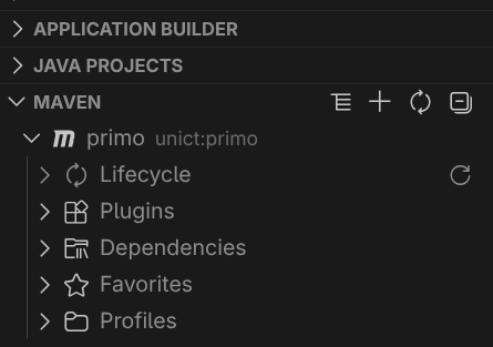 Una volta creato il progetto usando maven dentro vscode vedremo questo menù in basso a dx, dove troviamo tutte le informazioni riguardanti il nostro progetto maven