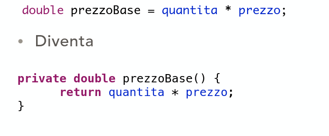 - Se il codice estratto modifica una variabile locale del metodo originario, dobbiamo vedere se è possibile mettere come valore di ritorno della funzione estratta quel valore. (Metodo sostituisci temp con query)