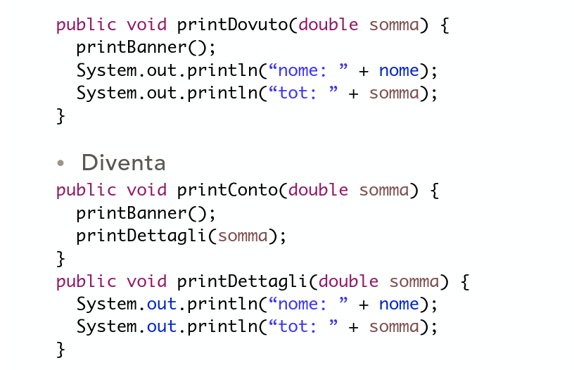 Le motivazioni sono diverse ma tre le principali troviamo la riscrittura di metodi lunghi in metodi più corti, quando si fa questa cosa con tutti i metodi, sembra quasi che i metodi di più alto livello (quelli che chiamano altre funzioni) siano formati da una di comment che descrivono esattamente quello che fa quel metodo, come vediamo nel metodo ‘printConto’.