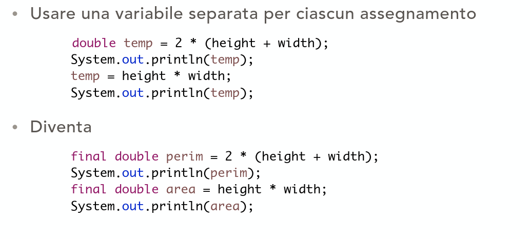 Una variabile temporanea è assegnata più di una volta, ma non è una variabile assegnata in un loop o usata per accumulare valori, quello che dovremmo fare è usare una una variabile separata per ogni assegnamento
